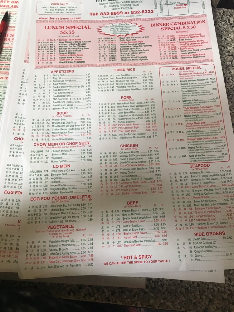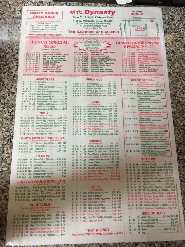 Dynasty Chinese Food offers a wide range of Chinese cuisine options and is located in Detroit, MI. The menu includes dinner combos like Almond Boneless Chicken and Beef with Broccoli, appetizers such as Crab Rangoons and Chicken Egg Rolls, and flavorful soups like Hot and Sour Soup. Customers praise the food quality, generous portions, and friendly staff. The restaurant is popular among Wayne State University members and is known for its quick service and affordable prices. Dynasty Chinese Food provides a cozy atmosphere with plenty of seating options, making it a great choice for casual dining or takeout. Don't miss out on trying their delicious dishes and experiencing the best Chinese food in the city.